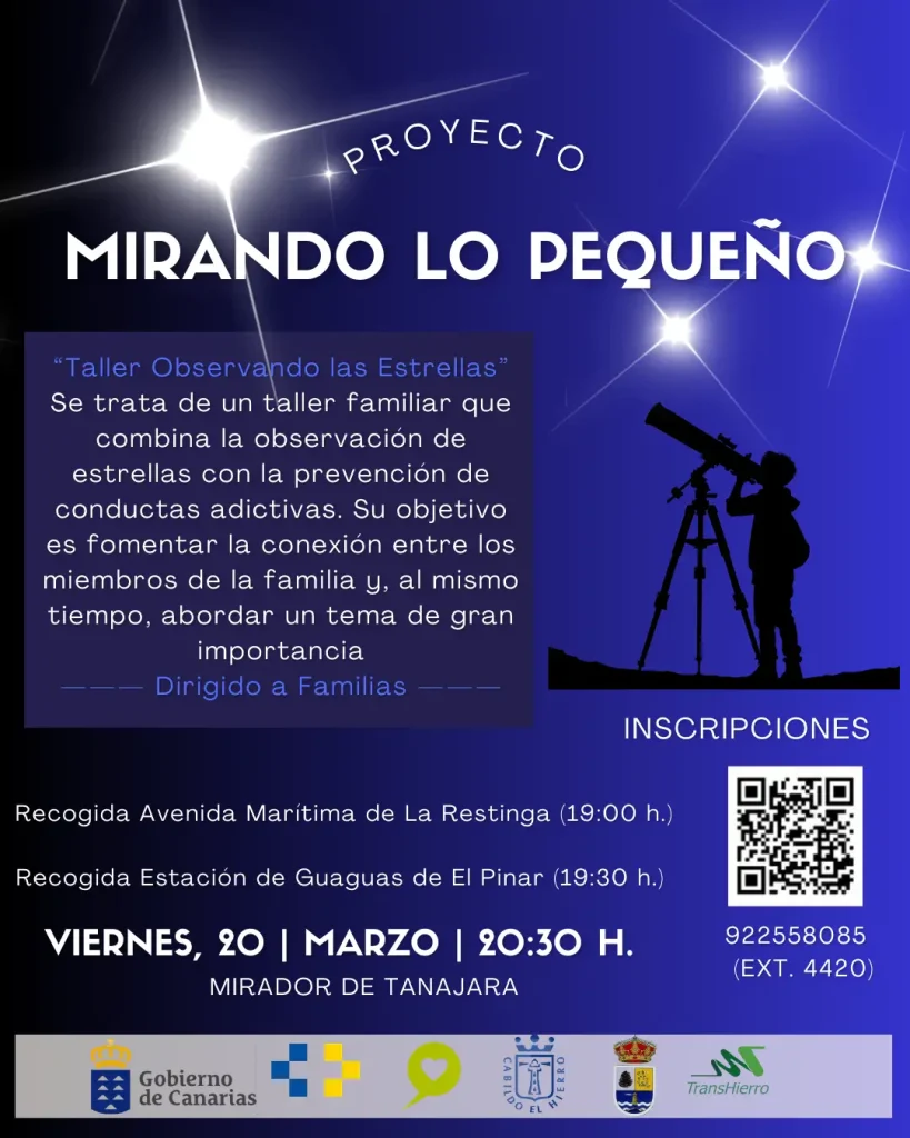 El punto de recogida será la parada de guaguas de la Avenida Marítima de La Restinga, a las 19.00 horas, y la Estación de Guaguas de El Pinar, a las 19.30 horas. La actividad cuenta con plazas limitadas y requiere inscripción previa antes del miércoles 18 de marzo, a través del teléfono 922 558 085 (ext.4419), o el código QR del cartel informativo.
