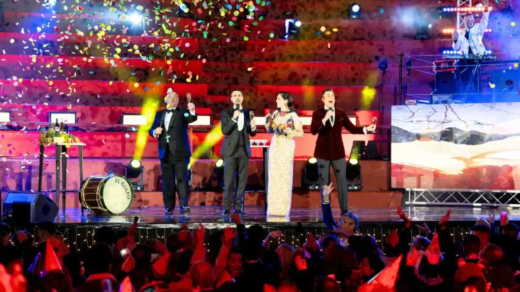 La gala fue retransmitida de forma simultánea por Televisión Canaria y Canarias Radio, y estuvo conducida por los principales presentadores de la casa, Eloísa González, Elvis Sanfiel, Mayer Trujillo y Matías Alonso, quienes guiaron la cuenta atrás con un formato dinámico y cercano. Las actuaciones musicales llegaron de la mano de El Combo Dominicano, Lucrecia y el DJ Ray Castellano, que cerró la noche con una sesión que se prolongó hasta la madrugada.